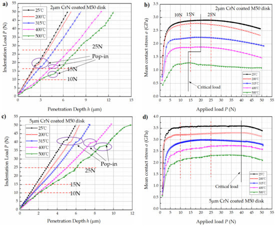Loading curves and corresponding contact stress curves of the samples as a function of temperatures in the load range of 1–50 N: (a) loading curves of 2 μm CrN coated M50 disk; (b) contact stress curves of 2 μm CrN coated M50 disk; (c) loading curves of 5 μm CrN coated M50 disk; and (d) contact stress curves of 5 μm CrN coated M50 disk.