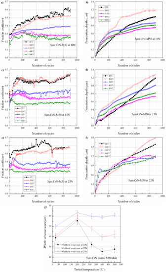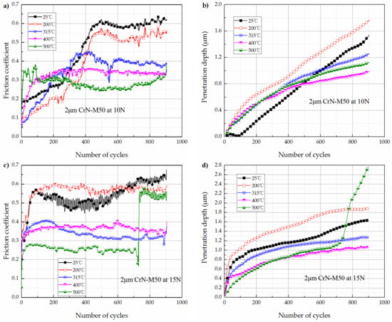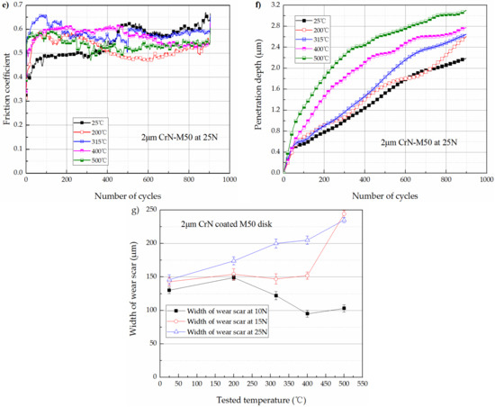 Figure 6a–f shows the friction coefficient curves and penetration depth during wear test of 5 μm CrN coated M50 disks as a function of temperatures under the tested loads of 10 N, 15 N, and 25 N. The variation of width of wear scars with temperatures is depicted in Figure 6g.