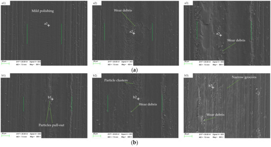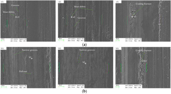 As illustrated in Figure 6a,c,e, running-in was presented by an increase of the friction coefficient during first several dozens to hundreds of cycles for all measured temperatures and loads. In the running-in stage, the friction force is mainly contributed to deform and fracture the contact asperities [25]. Due to the lower hardness of the coating material at higher tested temperature, it would take less number of cycles for the friction coefficient to reach the steady stage.