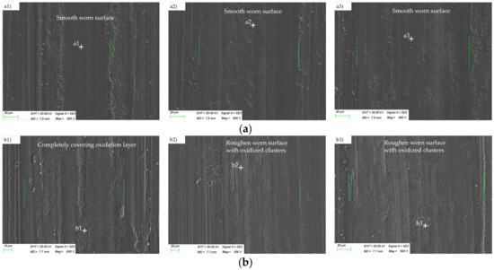 Figure 10 presents the morphology of worn tracks on 2 μm CrN coated M50 disks under various loads at the temperatures of 25 °C and 200 °C. As shown in Figure 10a1,a2,b1,b2, under the applied load of 10 N or 15 N, the worn tracks on 2 μm CrN coated M50 disks and the worn tracks on 5 μm CrN coated M50 disks presented similar morphology. The dominant wear mechanism for the 2 μm CrN coated M50 samples under the applied load of 10 N or 15 N was mild abrasive wear, corresponding to smooth worn surfaces with wear debris and narrow grooves presented in the worn area. However, when the load was increased to 25 N, local coating fracture can be observed on the edge of the wear scars for the 2 μm CrN coated M50 disks, as illustrated in Figure 10a3,b3. EDS analysis results are listed in Table 4. EDS analysis of the coating delamination area (Points a3, b3) confirmed the significant increasing of Fe element, indicating the partial detachment of coating material. The results above indicated that, at lower tested temperatures, the wear of CrN coatings transitioned from mild abrasive wear to the coating fracture controlled wear when the applied load exceeded its the load carrying capacity.