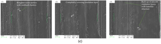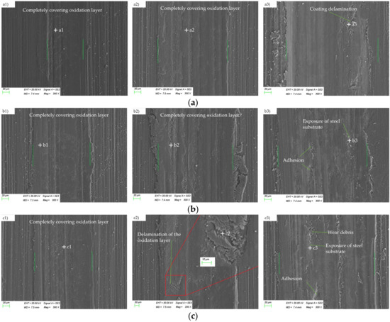 Figure 11 shows the morphology of worn tracks on 2 μm CrN coated M50 disks when the tested temperatures were equal or above 315 °C. As shown in Figure 11a1,b1,c1, under a tested load of 10 N, the dominant wear mechanism for the 2 μm CrN coated M50 samples was mild-oxidation wear when the tested temperatures were above 315 °C. In additional, under a tested load of 15 N, the wear of 2 μm CrN coated M50 samples could still be characterized as mild-oxidation wear at the temperature of 315 °C and 400 °C, as illustrated in Figure 11a2,b2. However, when the tested temperature was elevated to 500 °C, the oxidation layers were stripped from the surface of coating under the applied load of 15 N, as illustrated in Figure 11c2. It should be pointed out that the external load of 15 N just exceeded the load-bearing limitation of 2 μm CrN coated M50 disk at the temperature of 500 °C, as shown in Figure 5c,d. While the tested load was increased to 25 N, no obvious oxidation layers were detected after wear tests at temperatures of 315 °C, 400 °C and 500 °C, as illustrated in Figure 11c3,d3,e3.