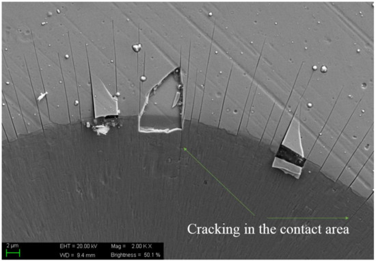 Taking the 2 μm CrN coated M50 disks as an example, under an external load of 15 N, which just exceeded its load bearing capacity at 500 °C, the stripping and piling up of the oxide film was observed, as illustrated in Figure 11c2. As pointed by Holmberg [29], this kind of thin film failure is related to the tensile fracture and subsequently detachment from the interface. Cracks on the interface were an essential factor triggering this kind of failure. SEM observation verified that radical cracks were generated on the coating surface when the 2 μm CrN coated M50 disk was indented under a load of 15 N at 500 °C (see Figure 12).