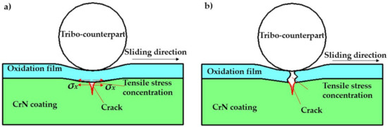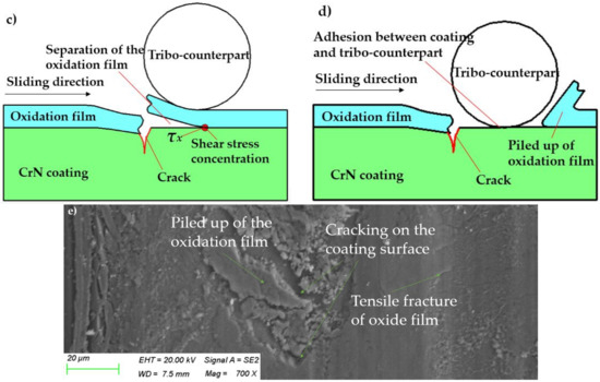 The chromium oxide film would act as a cantilever beam when cracks were on the surface of CrN coating. The stress concentration would be generated in the center of the cantilever beam, as shown in Figure 13a, thereby resulting in the tensile fracture of the oxide film, as depicted in Figure 13b. Then, shear stress concentration would be generated on the interface between the chromium oxide film and CrN coating surface. The shear stress concentration finally resulted in the separation of the oxide film from the coating surface, as illustrated in Figure 13c. As the failure of oxidation film occurred, the adhesion between coating material and tribo-counterpart occurred, resulting in the wear transition for CrN coated M50 steel, as illustrated in Figure 13d. The failure mechanisms for the oxide film was also confirmed by the morphology of wear tracks on 2 μm CrN coated M50 disks at the load of 15 N and temperature of 500 °C, as shown in Figure 13e.