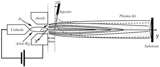 The general computational domain and basic boundary condition employed in the calculation of the plasma jet are described as follows: The thermal flow field is solved using a cylindrical coordinate system. The plasma gun wall temperature is set as 300 K, and the wall velocity is 0 with a non-slip condition. The axial length is 15 cm with 66 grid points, while the radial length is 6 cm with 57 grid points, and the scale of the circular direction is 2π with 32 grid points. More details about the boundary condition can be found in [,,].