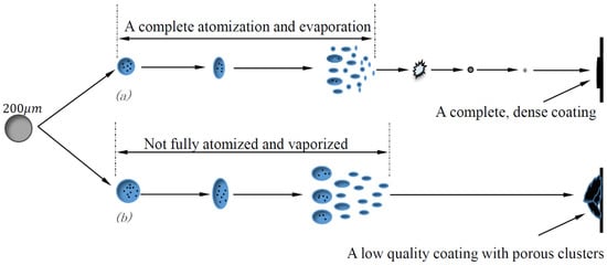 Many experimental studies have been conducted to explore internal mechanism and factors affecting SPS or SPPS processes. Previous research has illustrated that the process parameters are critical aspect for the entire thermal spray operation [,,,] and mastering the deposition mechanism and obtaining a proper controlled deposition rate are other important aspects worth our care []. These studies have shown that a dense nanostructured coating results from the deposition of overlapping splats under certain conditions. During the entire SPPS, the mass, heat, and momentum transfers between liquid feedstock, droplets, melting particle, and plasma plume needs a perfect adaption to the spraying material and the desirable structure, especially the rate of atomization and evaporation for droplets largely determining the produced or discharged position of sub-micro- and micro-sized particles’ impact upon the substrate [,,,]. When the droplet encounters an incomplete atomization and evaporation, the processed material cannot be shaped to an ideal state, which will affect the architecture of the coating surface, as the substrate will be fraught with numerous porous clusters instead of completely overlapping splats.