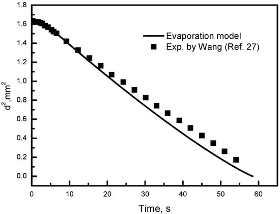 As in the present work, the simulation of the plasma flow field has been well validated in our previous research [,,,]. The new modeling of particles, mainly concerning the atomization and vaporization of droplets, is examined here in Figure 3, which displays the evolution of the hot water droplet diameter (d) in the environment of hot gas flow. Our droplet-vaporizing model shows good agreement with the experimental results in the published literature []. The maximum deviation between our vaporization model and the experiment is less than 2.6%. After validation, this new particle model could be employed in the plasma spray code, to study the phenomena of atomization and evaporation. Then, the plasma and droplet characteristics could be predicted and their effects on SPPS coatings could be investigated. The influence of plasma operating conditions, droplet size and distributions, and degree of salt pyrolysis are focused on.