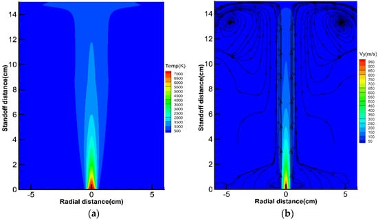 Gas temperature contour (a), and axial velocity contour with streamlines (b).