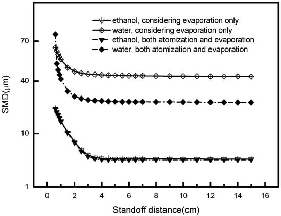 Figure 5 depicts the SMD variation for these two cases, for water and ethanol droplets, respectively. For ethanol droplets, the SMD variation is small, either considering atomization or not. This means that the secondary breakup does not play a significant role for the ethanol droplets. The reason is that extremely fine droplets have been formed after injection, and further breakup due to the aerodynamic force could not improve their disintegration degree. Therefore, the vaporizing effect of ethanol droplets matters a great deal, and a higher plasma temperature might give rise to a better coating quality using this liquid.