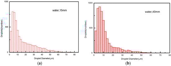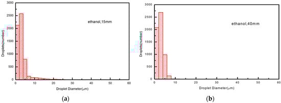 The acting mechanism we mentioned above will lead to a disparate droplet size distribution in the axial cross-section which, in turn, unravels much more underlying details concerning it. As shown in Figure 6 and Figure 7, we examine the droplet size distributions in two cross-sections at the standoff distance of 15 mm in the hot core region and 40 mm in the secondary breakup region, respectively, for water and ethanol droplets in an Ar-H2 atmosphere. We noted that the number of smaller droplets (d ≤ 10 μm) usually outweigh those of the larger ones (d ≥ 20 μm), regardless of liquid or gas types.