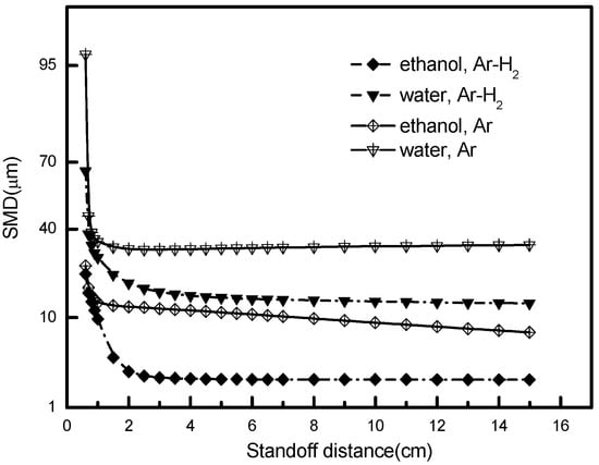 Figure 8 depicts the SMDs of ethanol and water droplets in different plasma atmospheres. It reveals that ethanol has a smaller droplet size than water for the same plasma gas, due to its low surface tension and low boiling point. For the same liquid, Ar-H2 plasma produces a smaller droplet size than Ar plasma, since the presence of hydrogen enlarges the gas heat capacity and, thus, more thermal heat can be transferred to the droplets. In the current study, the minimum droplet diameter obtained in Ar gas is 14 and 33 μm for water and ethanol, respectively. However, in Ar-H2 gas, we could obtain much smaller minimum diameters as 2.5 and 20 μm, for water and ethanol, respectively. The shift from Ar to Ar-H2 leads to the enhancement of the plasma dynamic velocity and thermal enthalpy, eventually boosting the fragmentation of droplets []. This is essential for water-based SPPS coatings: Only Ar-H2 plasma could render the favorable occurrence of complete water disintegration.