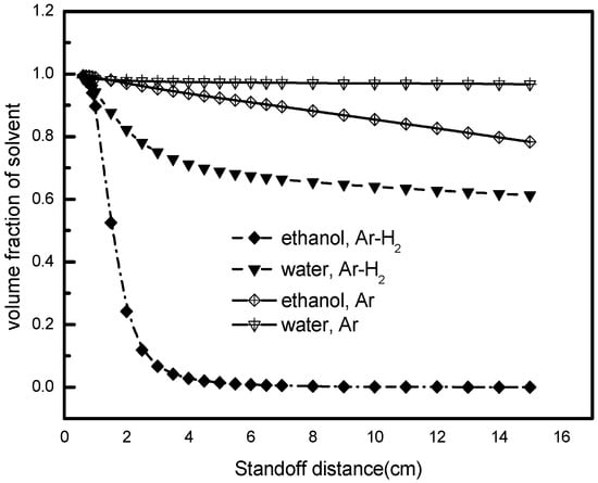 In addition to the droplet size and distribution, the solvent fraction is another important characteristic for the droplets’ degree of pyrolysis. The lower the solvent fraction, the higher the salt degree of pyrolysis will be. The solvent fraction here refers to the proportion of solvent in the droplet. It depends on the extent of droplet evaporation. Figure 9 shows that the solvent fraction experiences a visible decay, principally caused by the vaporization effect. Such decay depends on the liquid and plasma gas conditions. The volume fraction of ethanol decreases more rapidly compared to that of water, and Ar-H2 plasma produces further decay of the solvent than Ar plasma, mainly because the Ar-H2 atmosphere provides higher specific enthalpy, compared to pure Ar gas. Another reason is that the composite hydrogen in the plasma gas results in the higher velocity and dynamic pressure, which enlarges the shear rate of the gas and helps to break up the liquid into fine and desirable droplets downstream of the nozzle exit []. Therefore, it could be concluded that droplet evolution in SPPS prefer a solvent with low surface tension and a low boiling point in gas mixture with H2, which agrees with the previous observations in Section 5.3.