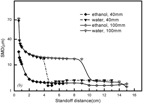 Apart from the effects of solvent and plasma gas properties, the substrate is another major factor affecting the droplet state in-flight history. The substrate should be set in a position where there is enough time left for the droplet to vaporize and the salts to pyrolyze, without forming the overheating nanoparticle that completely vaporizes before hitting the substrate [,]. As shown in Figure 10, the substrate mostly affects the water droplet size downstream of the torch outlet, but for ethanol droplets it does not, because ethanol droplets remain in a maturely-evolved situation before hitting the substrate so that the substrate cannot impose an overwhelming effect on the droplet size. From Figure 10, it can be seen that a sharply atomized rate and fine droplet size will occur when we locate the substrate in the specific secondary breakup region if the standoff distance is less than 6 cm. Thus, substrate location needs to be carefully assessed in the combination with the solvent properties and gas mixture types in order to achieve a desirable coating structure.