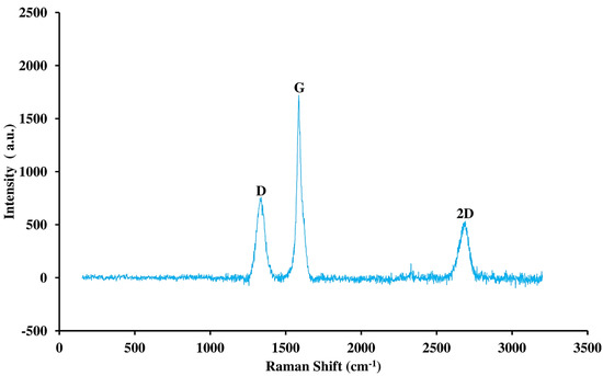 The two signature Raman peaks of graphene are a G peak at 1580 cm−1 and a 2D peak at 2700 cm−1 (Ferrari et al. [25]). The ratio of intensities of the G and 2D peaks (IG/I2D), i.e., a measure of the number of graphene layers, is ~0.5 for a single layer in the case of the Cu-Ni alloy and increases linearly with the number of layers. The IG/I2D ratio in a typical Raman spectrum in Figure 1 of the graphene films deposited in the present study is 3, which indicates 5–6 layers of graphene (the Raman spectrum in Figure 1 is representative of 5–6 such spectra (see Supplementary Materials Figure S2 for reproducibility)). The thickness of graphene coating in this study is around 1.675–2.01 nm (considering that there were 5–6 layers and the thickness of a single layer of graphene is 0.335 nm). The D-peak at 1350 cm−1 signifies the extent of defects in graphene [28]. The relatively high intensity of the D peak in Figure 1 indicates that the graphene layers had considerable defects (such as vacancies and strained hexagonal/non-hexagonal (pentagon or heptagon) distortions that are reported to result in corrugation and twisting of layers [28]).