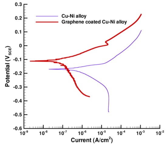 The cathodic and anodic plots were generated by sweeping the potential on either side of the OCP at a scan rate of 0.1667 mV/s (ASTM F2129-04 [24]) for graphene-coated and uncoated metal samples. The sweeping was carried out over the potential range of −300/+300 mV for graphene-coated and uncoated Cu-Ni alloy samples.