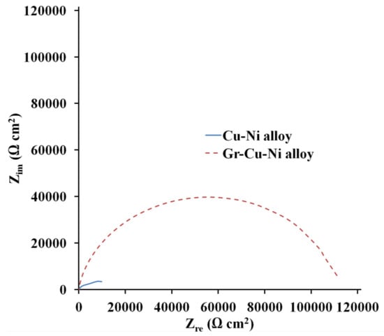 Nyquist plots showing the corrosion resistance of bare and graphene-coated Cu-Ni alloy in 0.1 M NaCl.