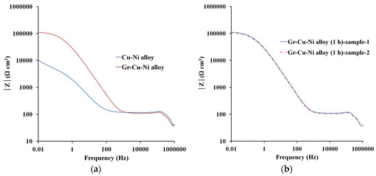 Bode plots: (a) for bare and graphene-coated Cu-Ni alloy (Gr-Cu-Ni); and (b) duplicate plots for graphene-coated Cu-Ni alloy showing reproducibility, in 0.1 M NaCl.