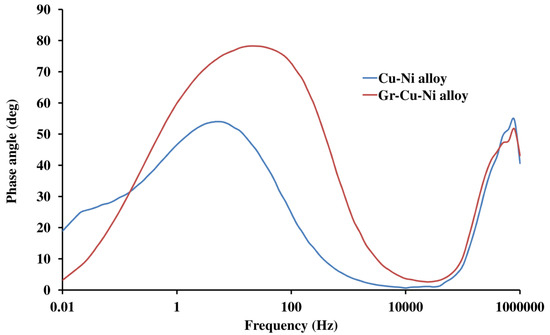 Bode phase angle plots for bare and graphene-coated Cu-Ni alloy (Gr-Cu-Ni) in 0.1 M NaCl.