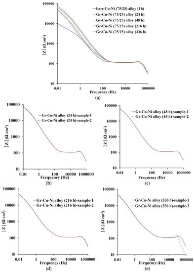 (a) Bode modulus plots for bare Cu-Ni alloy and graphene-coated Cu-Ni alloy (Gr-Cu-Ni) in 0.1 M NaCl (Note: the bare Cu-Ni alloy was only immersed for 1 h); and (b–e) Bode modulus plots showing the reproducibility of data after immersion for (b) 24 h, (c) 48 h, (d) 216 h, and (e) 336 h.