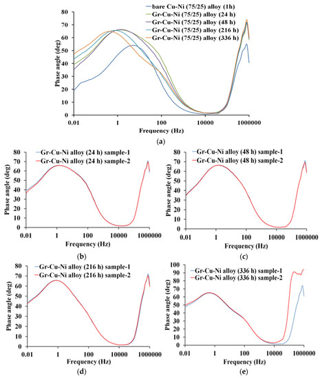 (a) Bode phase plots for bare and graphene-coated Cu-Ni alloy (Gr-Cu-Ni) in 0.1 M NaCl (Note: the bare Cu-Ni alloy was only immersed for 1 h); and (b–e) Bode modulus plots showing the reproducibility of data after immersion for (b) 24 h, (c) 48 h, (d) 216 h, and (e) 336 h.