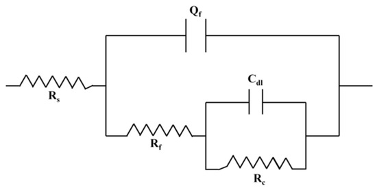 Simulation of experimental EIS data was carried out to quantitatively determine the characteristic parameters like capacitance, charge transfer resistance, pore resistance, etc. using a proper equivalent electrical circuit (EEC), taking into account a speculative corrosion mechanism. An EEC with two time constants is shown in Figure 9. There are two time constants: one in the high-frequency region corresponds to the graphene coating/solution and another in a lower-frequency region corresponds to the metal/solution interface.