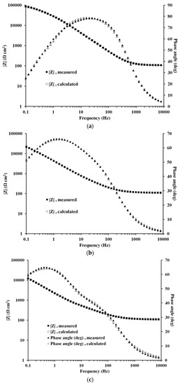 The data in Table 3 confirm that multilayer graphene coating improves corrosion resistance of a Cu-Ni alloy by an order of magnitude and this improvement in corrosion resistance is sustained for long periods of immersion (336 h), which is consistent with the Bode plots in Figure 5. The lower Qf of multilayer graphene indicates a lower number of conductive pathways in multilayer graphene coating and the relatively lower Cdl of multilayer graphene coating demonstrates the lower exposure of the metal/electrolyte interface. The exponent of CPE is close to 1, showing the almost completely capacitative nature of graphene coating. The low chi-squared value indicates the reasonable accuracy of EEC parameters obtained by EIS data simulation. Figure 10a–c demonstrates the fitting of simulated EIS data with the experimental EIS data of a graphene-coated Cu-Ni alloy for immersion periods of 1 h, 48 h, and 336 h, respectively. The experimental data match well with the simulated data in the frequency range from 10,000 Hz to 0.1 Hz, as is evident from Figure 10. The total error in the impedance analysis in the simulation of experimental data when utilizing EEC (Figure 9) was under 4% in all simulations. The low associated chi-squared values and low total error confirm the legitimacy of the utilised EEC (Figure 9) and corrosion mechanism for graphene-coated and uncoated Cu-Ni alloys.