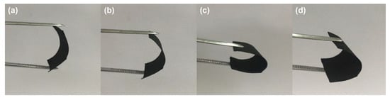 Figure 2a–c shows the SEM images of the paper, PPy–NTs, and PPy–NT/paper composite films, respectively. Figure 2d shows the TEM image of PPy–NTs. The diameter of the prepared PPy–NTs is ~70 nm to 150 nm, and the lengths are in the μm-range. The PPy–NTs are found to be uniformly coated on the surface of paper. Figure 2e shows the SEM image of the fracture surface of the PPy–NT/paper composite films. The film thickness measured based on the Figure 2e is ~124 μm, which is slightly thicker than that of the common printing paper (110 μm). This is mainly because the surface of paper was coated by PPy–NTs. After the PPy–NT coating, the color of paper changed from white to black. The prepared PPy–NT/paper composites have a good flexibility (Figure 3a–d).