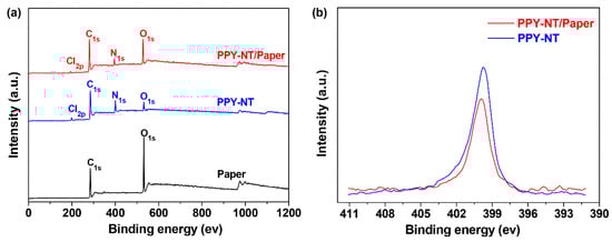 (a) XPS spectra of wide region spectroscopy of paper, PPy–NTs, and PPy–NT/paper composite film; (b) XPS spectra of N1S of PPy–NTs and PPy–NT/paper composite film.