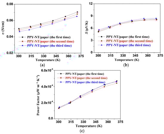 The electrical conductivity, Seebeck coefficient, and power factor of the PPy–NT/paper are shown in Figure 5. The sample was cycled three times in the measured temperature range from ~300 K to ~370 K. Both the electrical conductivity and Seebeck coefficient are very stable. The electrical conductivity of the composite films increased slowly from ~0.048 S/cm to ~0.068 S/cm (average value for three measurements) as the temperature increased from ~300 K to ~370 K. However, this value is still lower than that of the PPy particle (3.98 S/cm) [], PPy–NT film (9.81 S/cm) [], HCl doped PPy–NTs (10.6 S/cm) [], or PF6 doped PPy–NTs (2.4 S/cm) []. It is mainly due to the electrical isolation characteristic of paper []. The Seebeck coefficient also increased slowly from ~5.34 μV/K to ~8.21 μV/K (average value for three measurements) as the temperature increased in the measured temperature range. The positive value of the Seebeck coefficient means PPy–NT/paper composite film is a p-type TE material. This value is lower than that of reported elsewhere, such as PPy particle (9.72 μV/K) [], PPy–NT film (17.68 μV/K) [], HCl doped PPy–NTs (11.4 μV/K) [], and PF6 doped PPy–NTs (18.5 μV/K) as well [].
