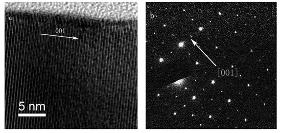 (a) HRTEM image of a typical single ITO crystal area; (b) an associated selected-area electron diffraction pattern.