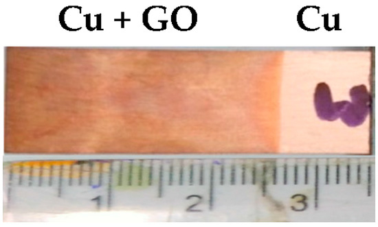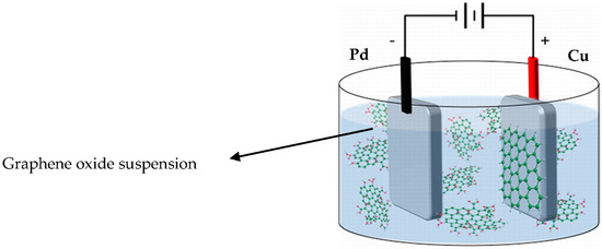 For electrophoretic deposition, the graphene oxide thus prepared was first dispersed in distilled water by ultrasonication (Probe sonicator) for about 10 min. The loosely held GO nano-sheets were completely dispersed, forming a brown translucent suspension. The streaming potential of the suspension measured by particle charge detector (PCD-04 pH; Mutek, Herrsching, Germany) showed a negative potential of −1000 mV at its natural pH (i.e., 3.4). Thus, an anodic electrophoretic deposition process (as shown in Figure 1) was used for coating GO on copper. A copper strip (3.5 cm × 0.8 cm) was used as the deposition electrode (anode) and a palladium (Pd) sheet (2 cm × 2 cm) was used as the cathode. The electrodes were hung vertically into the suspension in a glass beaker at a gap of 2 cm from each other. A constant dc voltage (10 V) was applied to the suspension for an optimized time of 1 s, using a source meter (Model 2410, Keithley Instruments Inc., Cleveland, OH, USA). The coated green samples were dried overnight at room temperature [29].