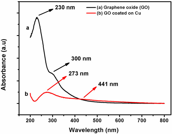 The UV-Visible spectra of GO is shown in Figure 3. In this absorbance spectra, the main spectrum of GO (Figure 3a) has an absorption peak at 230 nm, attributed to π-π* transition of the aromatic C–C ring and weak absorption at 300 nm due to n-π* transition of C–O bond [42]. The GO coated on copper surface was scrapped and was dispersed in de-ionized water for UV analysis. It shows a very low intense absorption peak of π-π* transition of the aromatic C–C ring, which has been red shifted to 273 nm due to the extended conjugation of double bond in the aromatic ring. This red shift indicates the reduction of some functional groups like epoxy, –OH group, etc. Generally, oxidation occurs at anode and reduction at cathode. However, UV analysis of coated GO (Figure 3b), scrapped from copper anode in the electrophoretic deposition, suggests that a partial reduction of GO has taken place at the anode during EPD. The suggested mechanism of reduction is as follows [43]: