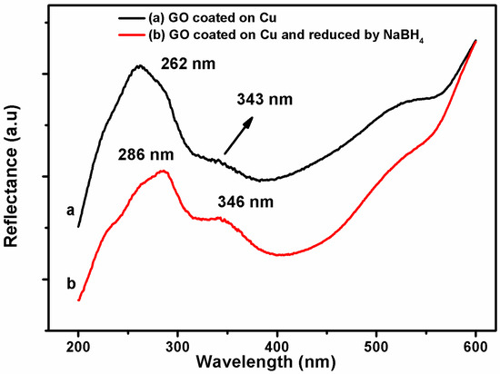 For the characterization of GO coated electrophoretically on copper, UV analysis was done in reflectance mode using the thin film attachment. The results are presented in Figure 4. The spectrum of GO on copper (Figure 4a) shows a reflectance peak at 262 nm due to π-π* transition of the aromatic C–C ring and a reflectance peak at 343 nm due to n-π* transition of C–O bond. The spectrum of GO coated on Cu and completely reduced by NaBH4 has been red shifted and shows a strong reflectance peak at 286 nm for π-π* transition and a shoulder at 346 nm for n-π* transition (Figure 4b). This is partially due to the extended conjugation of double bond in the aromatic ring because of the electrochemical reduction of GO during EPD.