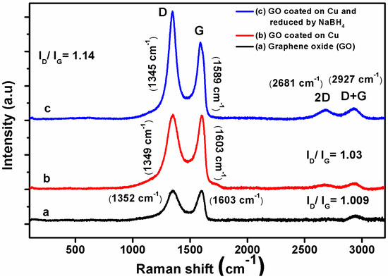 Raman spectroscopy of (a) graphene oxide (GO), (b) GO coated on Cu, and (c) GO coated on Cu and reduced by NaBH4.