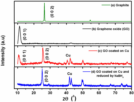 XRD patterns recorded for (a) pristine graphite, (b) graphene oxide (GO), (c) GO coated on Cu, and (d) GO coated on Cu and reduced by NaBH4.
