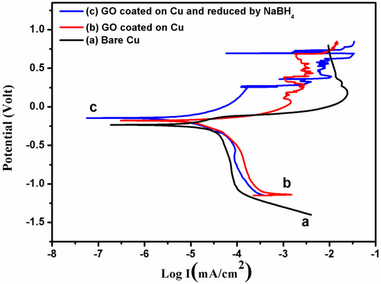 Figure 10 shows the potentiodynamic polarization curves of bare Cu, GO coated on Cu and GO coated on Cu after reduction. During this test, the anodic dissolution rate of Cu at a given potential is estimated by the anodic current densities, while the rate of oxygen reduction reaction determines the cathodic current densities. The polarization curve of GO coated on Cu and GO coated on Cu after reduction exhibits more positive magnitude in comparison to bare Cu, suggesting that GO coated on Cu remarkably decreases the dissolution of copper [20]. The corrosion potential, Ecorr, (i.e., the intercept of the anodic and cathodic regions of the plot) of GO coated on Cu after reduction has more positive value (−145.4 mV) in comparison to GO coated on Cu (−182.2 mV) and bare Cu (−235.3 mV) in saline environment containing 3.5 wt % NaCl solution. This signifies that GO coated on Cu after reduction acts as a very strong passivation layer against ion diffusion and corrosion. On the other hand, the decrease in current density (Icorr) from 15.375 µA/cm2 for bare Cu to 7.01 µA/cm2 for reduced GO coated on Cu proved that GO coating acts as a barrier to the underlying Cu surface and therefore inhibits the Cu attrition.