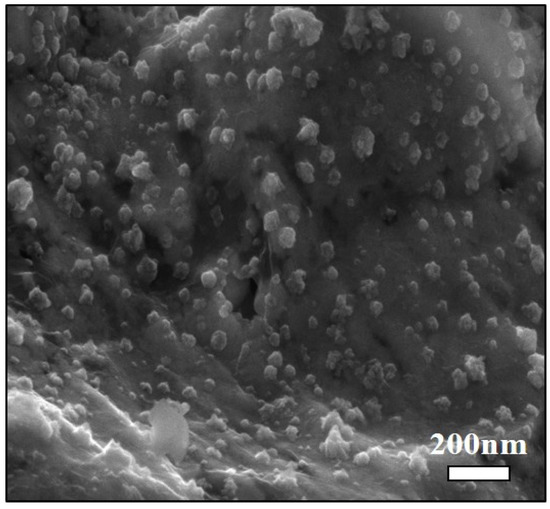 FESEM micrographs of GO coated on copper and chemically reduced by NaBH4 after 10 min of exposure to 3.5 wt % NaCl solution at room temperature is depicted in Figure 11. The surface of the coated sample seems to degrade at some isolated areas, but is almost undamaged. This reveals the fact that graphene oxide is strongly adhered to the surface of the copper, protecting it from corrosion by the strong salt solution. The spherical dot like morphology on the surface is possibly a result of local aggregation of the reduced graphene oxide (rGO) due to its interaction with NaCl. The stability of reduced graphene oxide (rGO) materials is not well understood till date. Qi et al. [51] examined the electrokinetic properties and aggregation kinetics of three rGOs that were synthesized by reducing graphene oxide (GO) with N2H4, NaBH4, and l-ascorbic acid. In NaCl solution, the critical coagulation concentrations of the materials correlated reasonably with their C/O ratios. The increased aggregation tendency of rGOs was caused mainly by their increased hydrophobicity rather than decreased surface charge negativity. For both monovalent and divalent cations, less densely hydrated cations were more effective in causing aggregation than more densely hydrated cations.