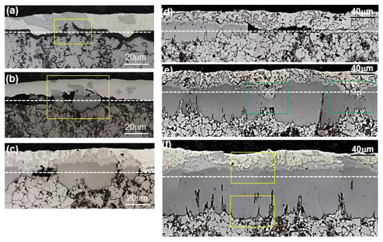Cross-sectional optical microstructure of specimens hot dipped for various dipping times. (a) 30 s; (b) 40 s; (c) 50 s; (d) 90 s; (e) 100 s; (f) 120 s.