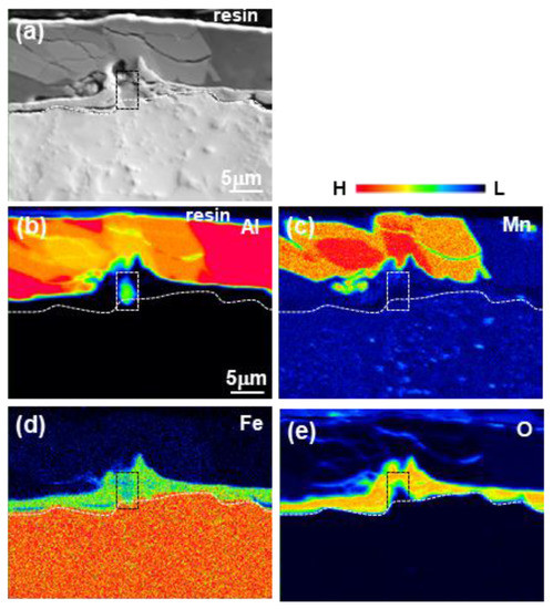 Figure 2 shows the results of the back-scattered electron (BSE) image in which the reaction phase is present (Figure 1a) and the Fe and O components of Al, Mn, and steel. The white line shows the original steel surface. A band structure with high concentrations of Fe (Figure 1d) and O (Figure 1e) was formed on the surface of the steel. From this result, this layer is considered to be a Fe-based oxide layer. On the other hand, the elliptical shape phase in the area indicated by γ on the surface coexisted with the coating components Al and Fe, but Mn and O are not detected. Thus, the reaction phase formed where the oxide layer broke, and the Al-Mn coating solution permeated, reacting with the steel to form the reaction layer.