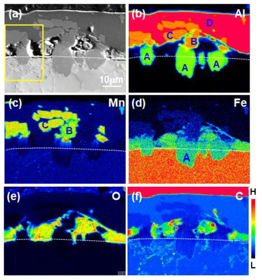Figure 3 includes an enlarged SEM microstructure and an EPMA surface analysis results of the area denoted by γ in Figure 1b, where specimens were dipped for 40 s. A reaction layer formed and increased in the absence of an oxide layer. The reaction layer can be classified into four phases—A, B, C, and D—from the comparison of the Al, Mn, and Fe concentrations with the formed positions, either at the steel surface or coating layer. The A phase contains a high concentration of Al and Fe but contains no Mn and was formed in the coating layer and the steel interior. The B phase formed in the coating layer and was a high concentration of Al and Mn, but was characterized by a small amount of Fe, which was connected to the A phase and the end. The C phase had a slightly higher in Mn concentration than the B phase. Phase D consisted almost entirely of Al.