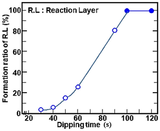 Figure 5 shows the formation rate which is defined as the ratio (%) of the formed reaction layer to the measurement length (10 mm) from the cross-sectional structure. The reaction area increased with an increase in the dipping time, and the reaction layer formed over the entire surface at 100 s. Moreover, the thickness (in the depth direction) distribution of the reaction layer was non-uniform, as shown in Figure 1e, but the specimen after hot-dipping for 120 s had a uniform reaction layer.