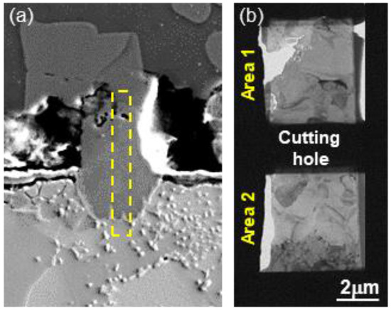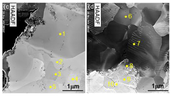 (a) Back-scattered electron (BSE) structure enlarged of area denoted as γ in Figure 3a,b TEM specimen took at area denoted as γ in (a) using FIB; (c,d) HAADF image of area 1 and area 2 in (b), respectively.