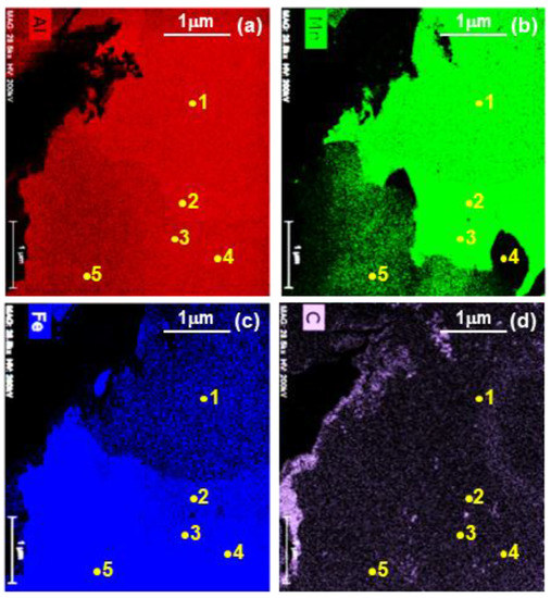 Results of TEM-EDS (Transmission Electron Microscopy-Energy Dispersive Spectroscopy) analysis in Figure 6c. (a) Al; (b) Mn; (c) Fe; (d) C.