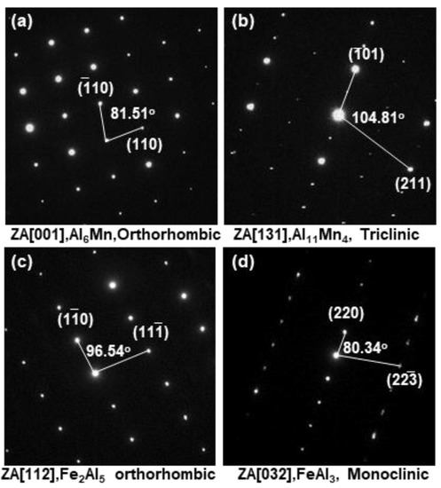 Figure 8 shows the results of the diffraction pattern in the area indicated by 1–5 in Figure 6c and the diffraction pattern analysis obtained the composition analysis result in Table 2. From the diffraction pattern analysis, Point 1 phase is Al6Mn (orthorhombic), Point 2 and 3 phases are Al11Mn4 (triclinic) phase, point 4 phase is Fe2Al5 (η, orthorhombic) phase, and point 5 phase is FeAl3 (θ, monoclinic) phase.