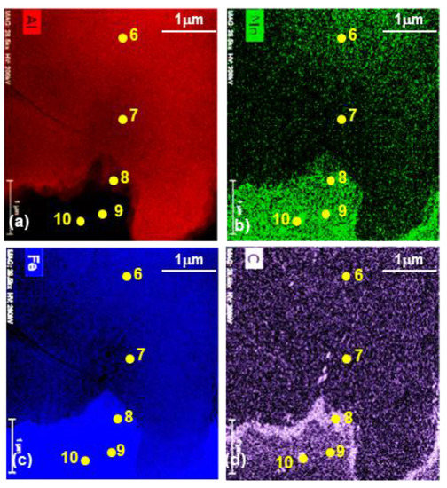 Energy-dispersive spectroscopy (EDS) analysis results (at./wt.%) of phases denoted as 6–10 in Figure 6d, respectively.