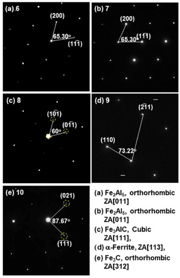 Results of the diffraction pattern in the area indicated by 6–10 Figure 6d. (a,b) Fe2Al5 (η); (c) Fe3AlC (κ); (d) α-Fe; (e) Fe3C.
