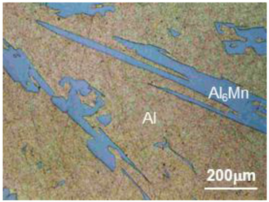 The microstructure of the coating layer was classified into a reaction layer (reactive phase) formed while maintaining the dipping temperature and a solidified structure formed during cooling of the coating liquid. Figure 11 shows the microscopic optical structure of the Al-7 wt.% Mn cast alloy, which consists of matrix Al and Al6Mn.