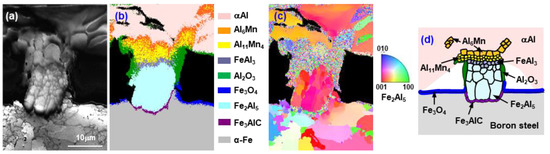 - Cheng, W.-J.; Wang, C.-J. Study of microstructure and phase evolution of hot-dipped aluminide mild steel during high-temperature diffusion using electron backscatter diffraction. Appl. Surf. Sci. 2011, 257, 4663–4668. [Google Scholar] [CrossRef]