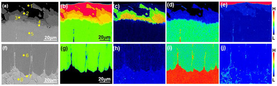 Scanning electron microscopy (SEM) microstructure and EPMA area results of the coating layers hot dipped for 120 s. (a,f) SEM microstructure; (b,g) Al; (c,h) Mn; (d,i) Fe; (e,j) C.