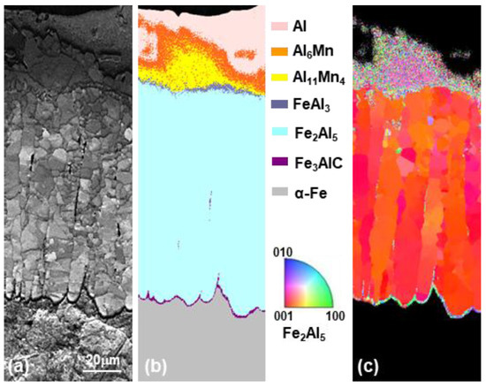 Consequently, the same microstructure arrangement formed initially (40 s). The arrangement from the coating layer toward the steel was, in order, Al + Al6Mn (coated alloy structure) → Al11Mn4 → FeAl3 (θ) → Fe2Al5 (η) → Fe3AlC (κ) → αFe (steel). The η phase dipped for 40 s (see Figure 11) mainly grew toward the liquid phase, whereas the specimen dipped for 120 s (Figure 14) grew very deep into the steel interior. The growth direction of the η phase was the same in the [001] direction.