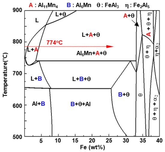 As seen in Figure 12b, all reaction phases except for Fe3AlC (κ) phase formed on the liquid side of the steel surface, the elements such as Fe dissolved and formed in the Al-7 wt.% Mn molten alloy. Thus, an (Al-7 wt.% Mn)-Fe quasi-binary phase diagram was calculated using Thermo-CalcTM (Ver.6.0, Stockholm, Sweden) to analyze phase transformation during and while maintaining the dipping temperature. Figure 15 shows the phase diagram. When Fe is added into the melts at a dipping temperature of 773 °C at 0.6 wt.% or more, solid Al11Mn4 (A) formed within the liquid phase. However, the phase in the coating layer composed of Al and Mn had two phases, Al11Mn4 and Al6Mn (B). In the phase diagram, Al6Mn does not exist at the dipping temperature, but does exist below temperatures of 725 °C. In particular, Al6Mn can form on Al11Mn4 or can form in the coating layer. With this distribution, the Al11Mn4 formed as the Fe concentration in the melts increased while maintaining the dipping temperature. And Al6Mn can crystallize in liquid phase during cooling or form on Al11Mn4 which is nucleation site during cooling. Therefore, Al11Mn4 and Al6Mn may be connected to each other. The reaction layer, except for the coating structure (Al + Al6Mn), was formed as Al11Mn4 → FeAl3 (θ) → Fe2Al5 (η) → Fe3AlC (κ) in the coating process, maintaining the dipping temperature. Al11Mn4 formed by reacting with the liquid phase, but the remaining FeAl3 (θ), Fe2Al5 (η), and Fe3AlC (κ) did not react directly with the liquid phase but instead would be formed by a solid-phase diffusion mechanism between Al11Mn4 and steel.